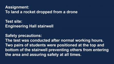 Although a drone would have dropped the rocket stage from a higher altitude, the fourth floor of Engineering Hall did the trick. Watch the video. Note: Safety precautions were taken for this test. It was conducted after normal working hours and two pairs of students were positioned at the top and bottom of the stairwell, preventing others from entering the area.